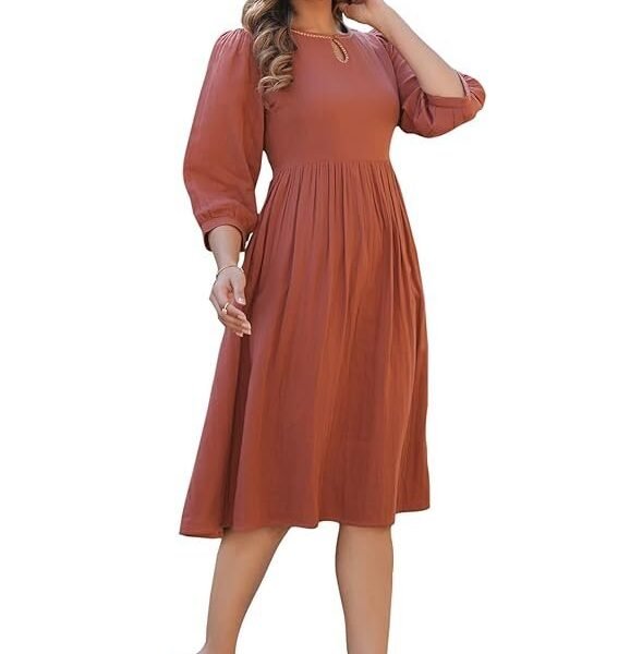 Women's Rust Orange Pure Cotton Solid Fit & Flare Dress