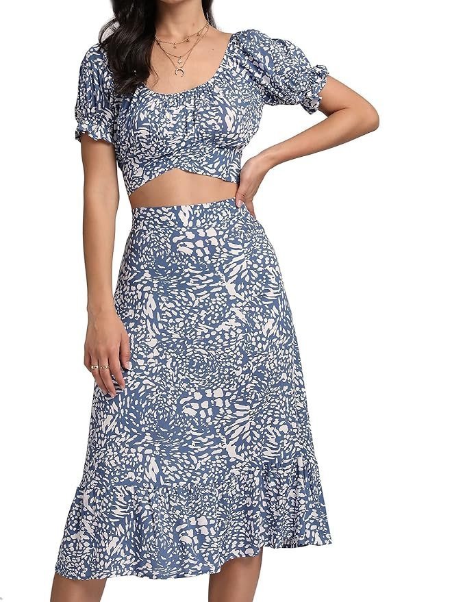Women’s 2 Piece Outfits Floral Self Tie Knot Crop Top and Midi Skirt Set, 2#blue, Small